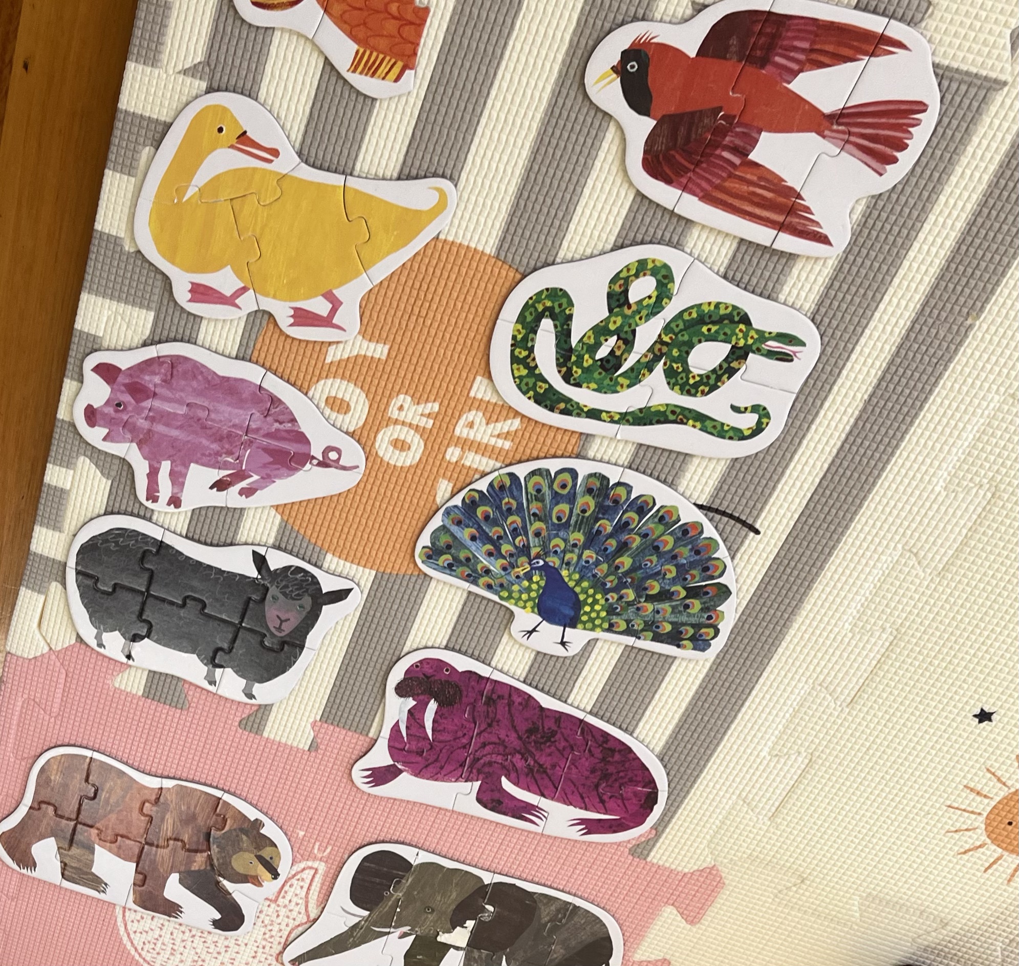 Do you know why I recommend this book to you? I did all the activities above with my 2-year-old daughter. This book has stayed her and my favourite night storybook for quite a long time (you’ll find it is one of the best books to read before sleep as the content of it is so simple and very repetitive, it even helps the child to fall asleep). I have to convince you that my daughter gradually learned all the names of the animals from the book and started to call her educator “teacher” after reading the book. She learned to count from 1 to 9 with this book. She started to realise that the words printed on the page conveyed sounds and meaning. Thus, she was thrilled and longed to read by herself. Realizing the question mark showed a question, she started to ask me, “What’s that?” one day. In addition to this, she remembered all the colours in the book and was very quick at sorting and making the puzzles. By making the puzzles, she learned more about the names of the animals.